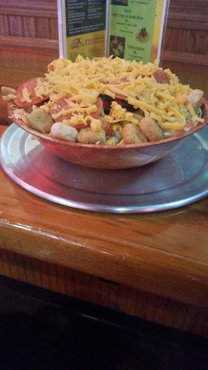 Had a better time than last time the pizza owner served us, and he was great. we had lots of fun we had the taco pizza and it was great.the score is for godfathers pizza since we did not eat the bars food but did get a pitcher of beer